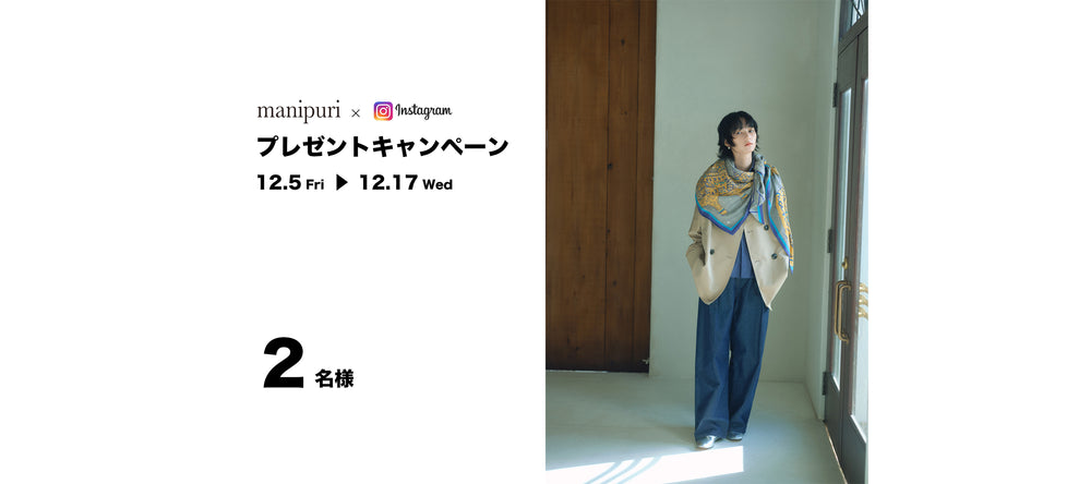 いつもmanipuriをご愛用いただき、誠にありがとうございます。日頃の感謝の気持ちを込めて、クリスマスギフトが当たるInstagramプレゼントキャンペーンを開催いたします。 ■ プレゼント内容抽選で 2名様 に「クリスマス限定ストール」をプレゼントいたします。※カラーはお選びいただけません...