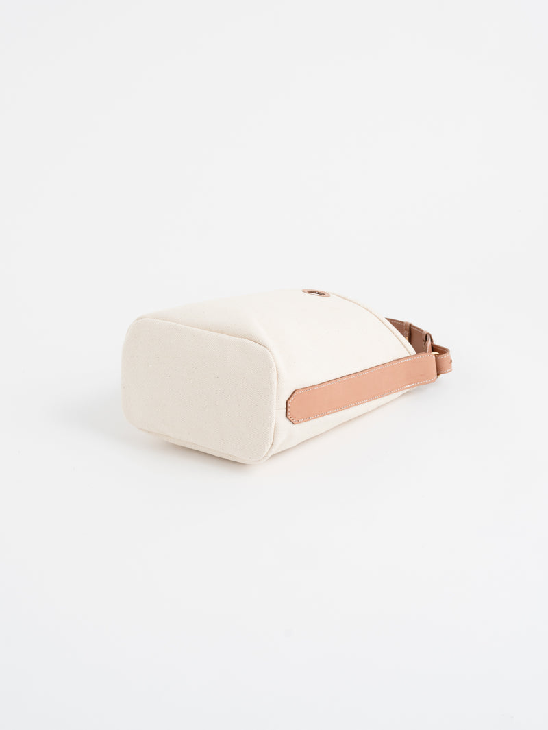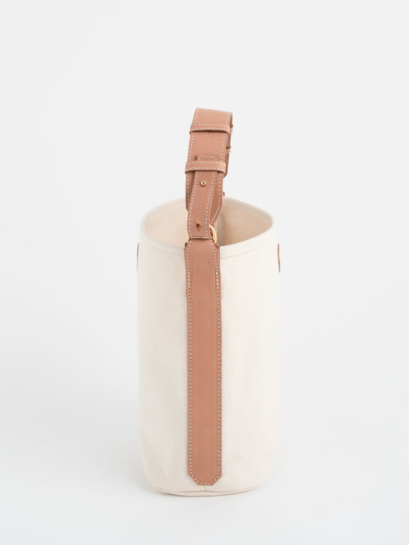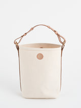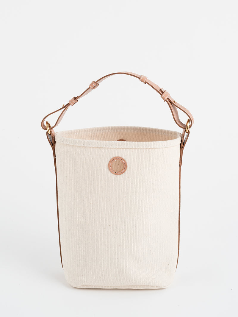 底が丸い形をしているので、見た目以上に収納力があります。ミニ財布やケータイ、ペットボトルを入れて持ち歩くのには十分なサイズ感。帆布生地で仕立てているため、丈夫で使い勝手も十分。毎日使ってほしいものだから、強度・耐久性に優れた厚地帆布で仕立てました。シンプルなデザインなので、どんなコーディネートにも馴染みやすい逸品です。