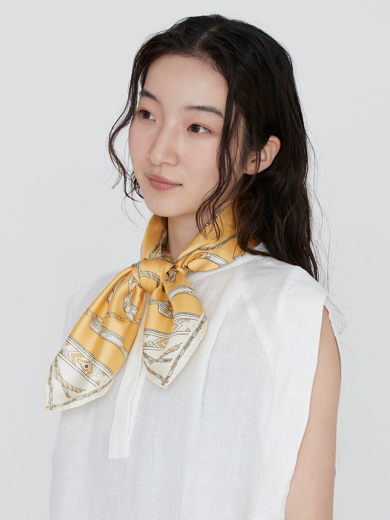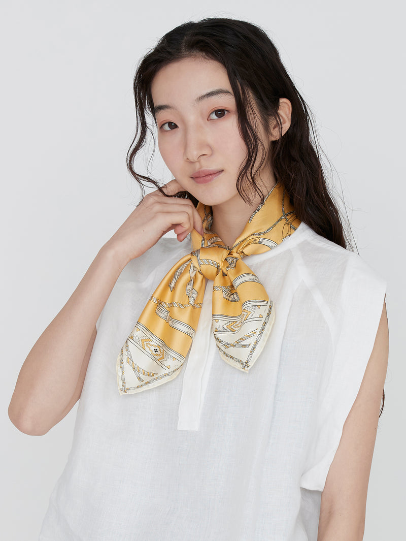 manipuriのスカーフは、日本の職人が1枚ずつ手捺染し、端を手巻きで仕上げております。生地は12匁綾織りシルクを使用。薄すぎず厚すぎず、とても滑らかです。シルクの艶やかな光沢感がカラーリングに更に明るさをプラスしてくれるので、コーディネートがぐっと華やかになります。