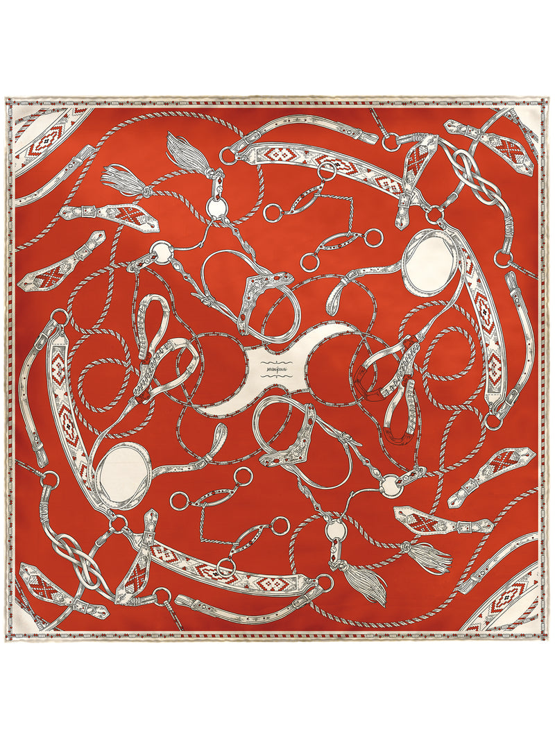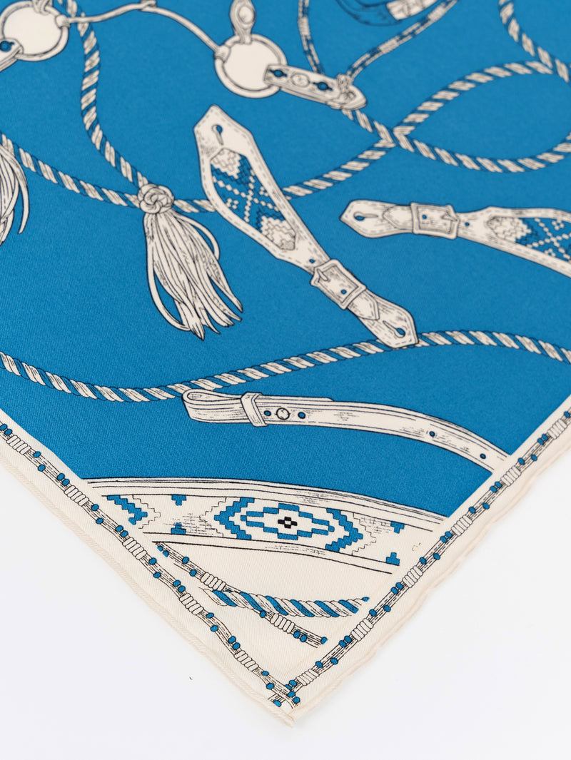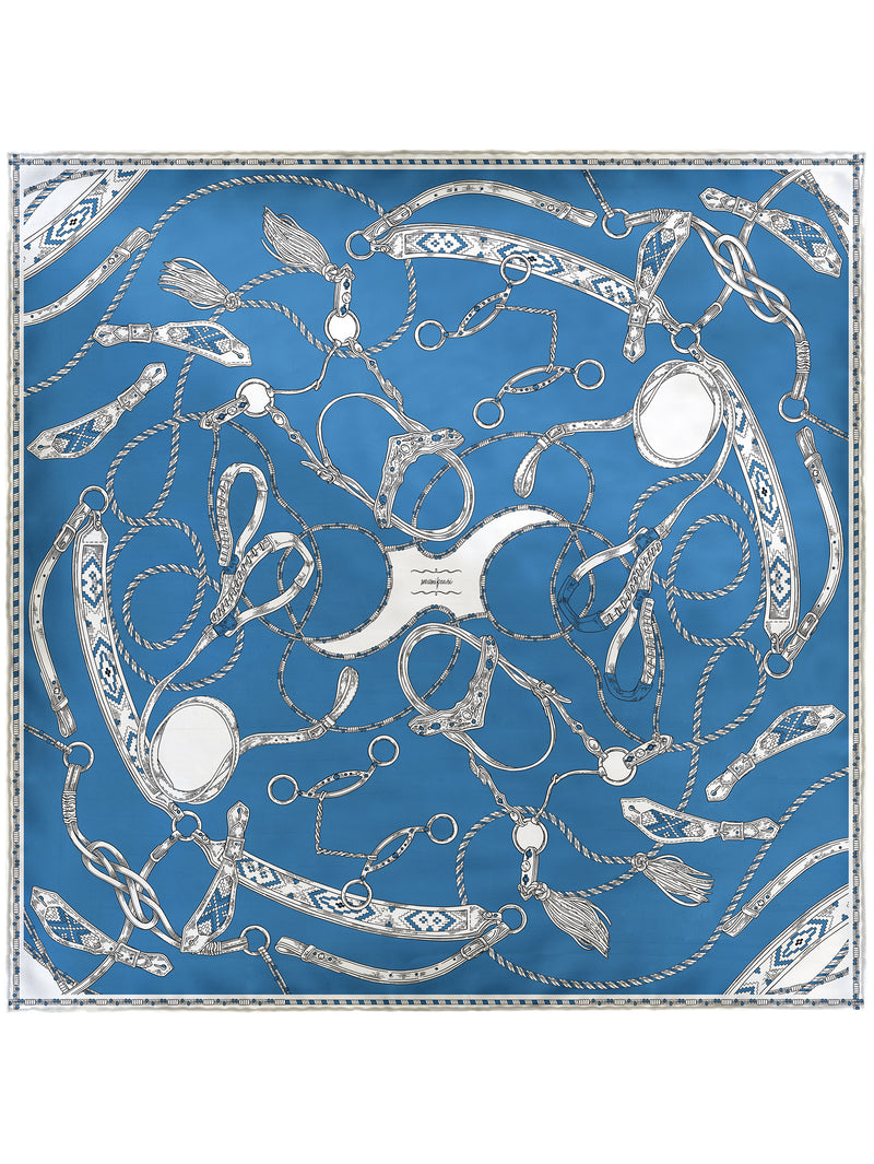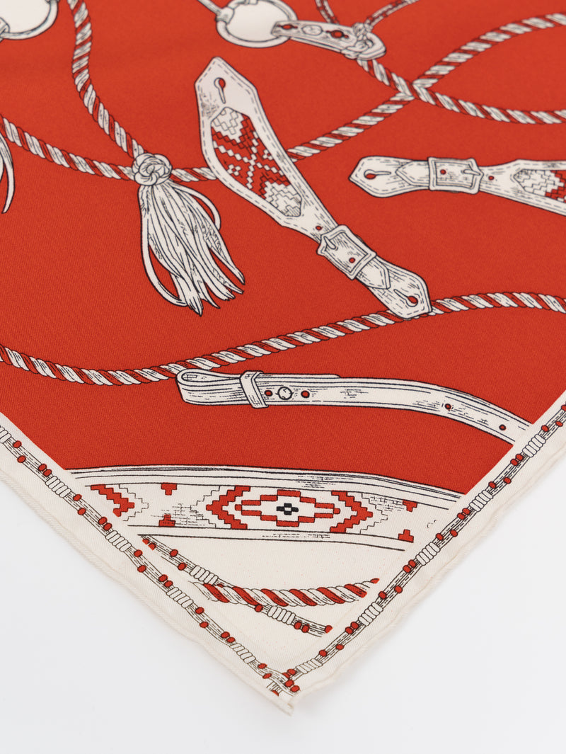 スカーフのモチーフとして親しまれるビット、馬具の柄。ニューメキシコのチマヨ村を起源とするオルテガ柄に彩られた様々な馬具をデザインに用いる事により、ネイティブなイメージに組み上げました。さらに、モノカラーな配色にアレンジされています。