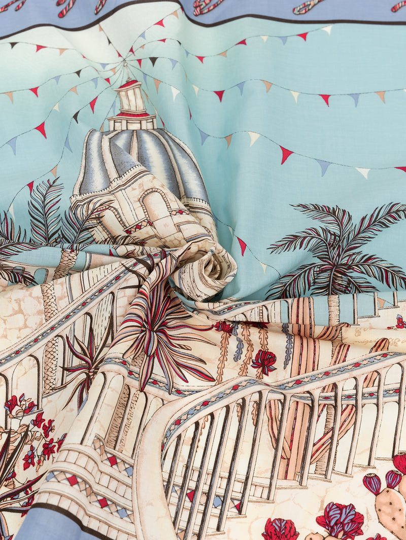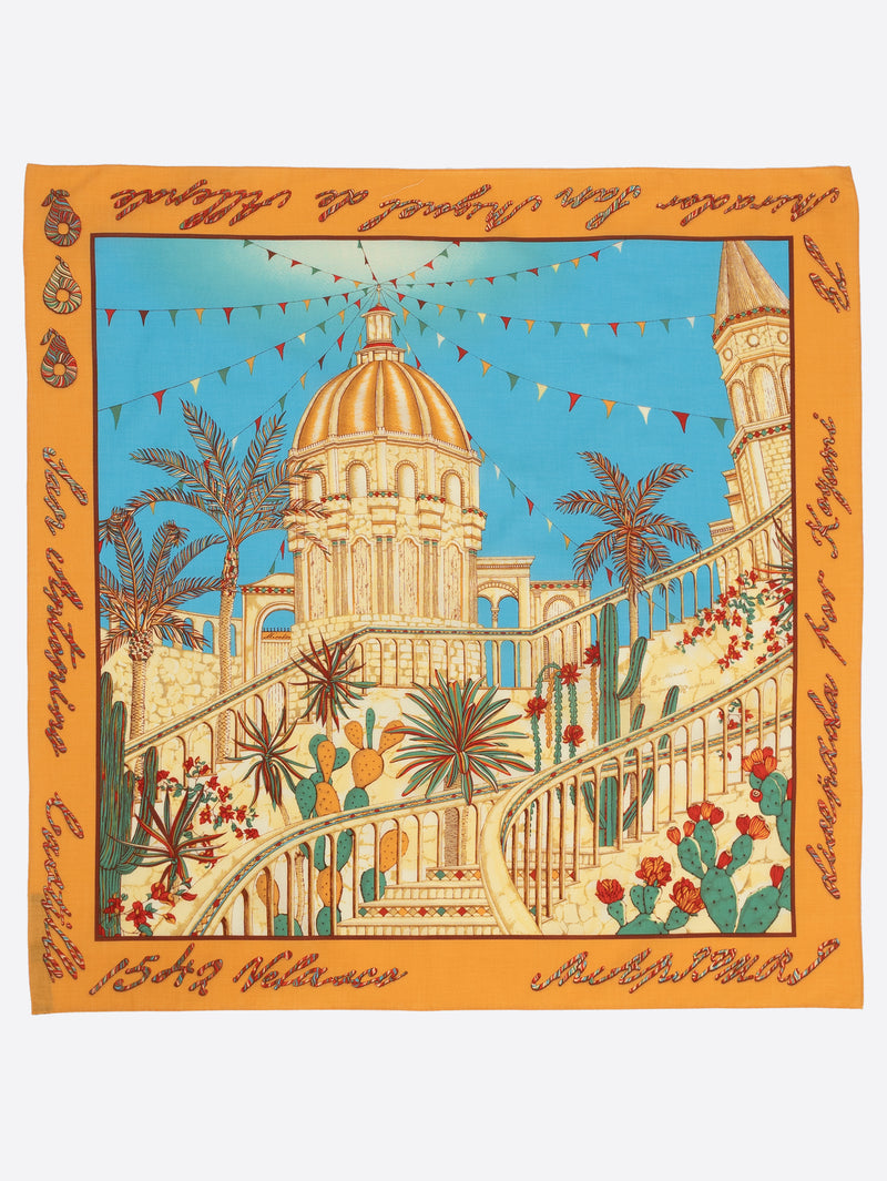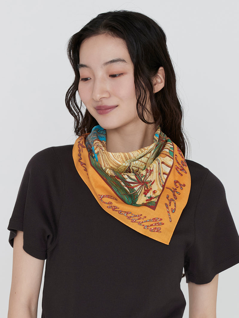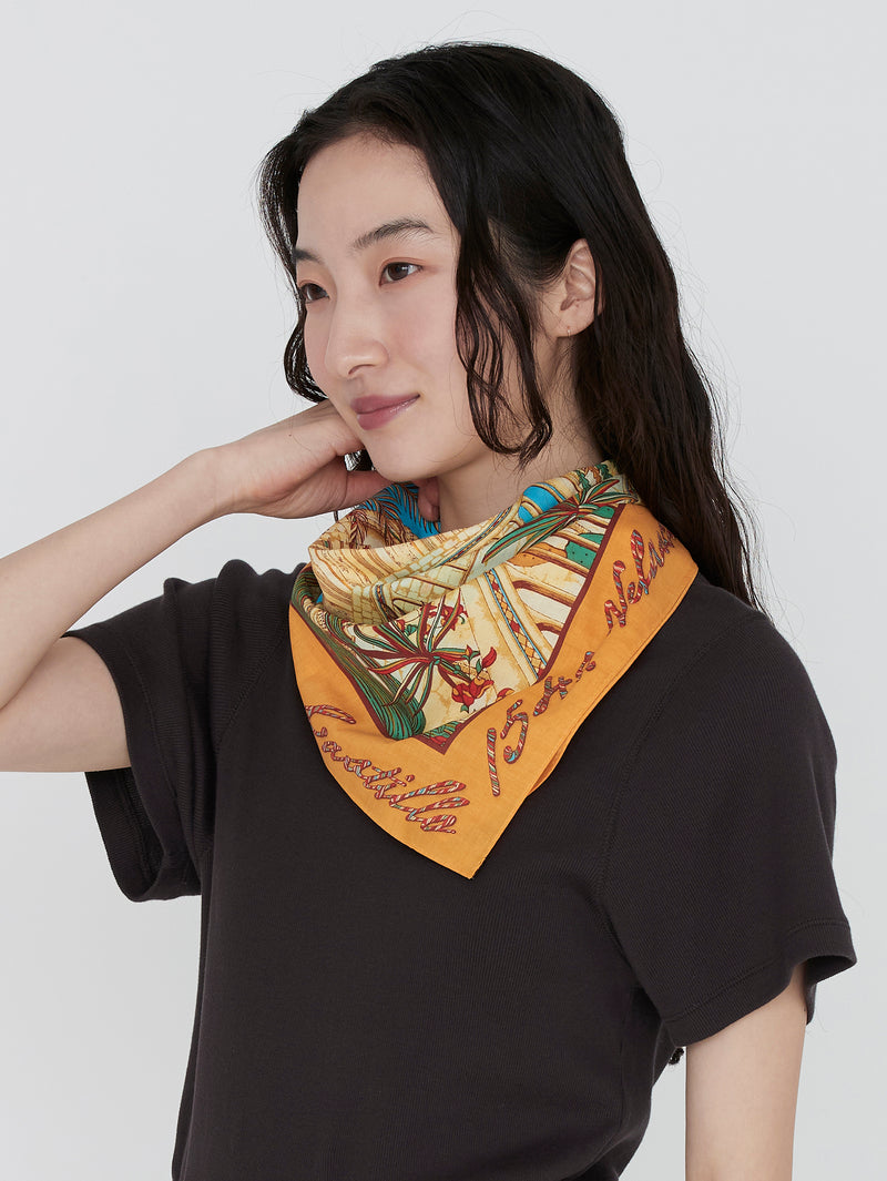 manipuriのコットンスカーフは、薄手のコットン100%の素材にシルクスカーフと同じ手捺染でプリントしています。こちらのアイテムは縁はミシン巻きで、洗い加工をかけてよりヴィンテージ感を出しています。手洗いができるので暑い時期にも気軽に巻けるアイテムになります。