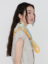 manipuriのコットンスカーフは、薄手のコットン100%の素材にシルクスカーフと同じ手捺染でプリントしています。こちらのアイテムは縁はミシン巻きで、洗い加工をかけてよりヴィンテージ感を出しています。手洗いができるので暑い時期にも気軽に巻けるアイテムになります。