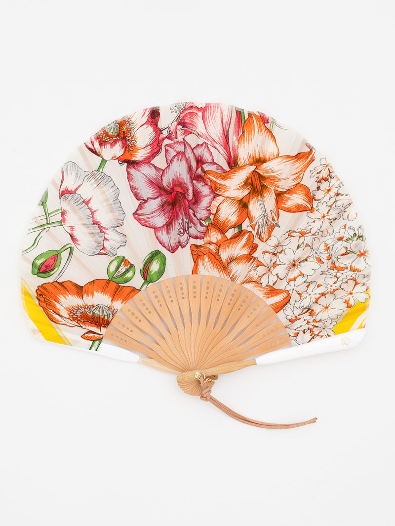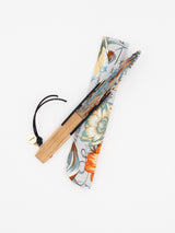 プリントとロゴの刻印入りで、風が集まりやすくなるようにバンブーのフレームがセンターが高くなった扇型のデザインになっております。職人が一本づつ仕上げた扇子で、上品なゴールドのチャームと革紐がポイントです。