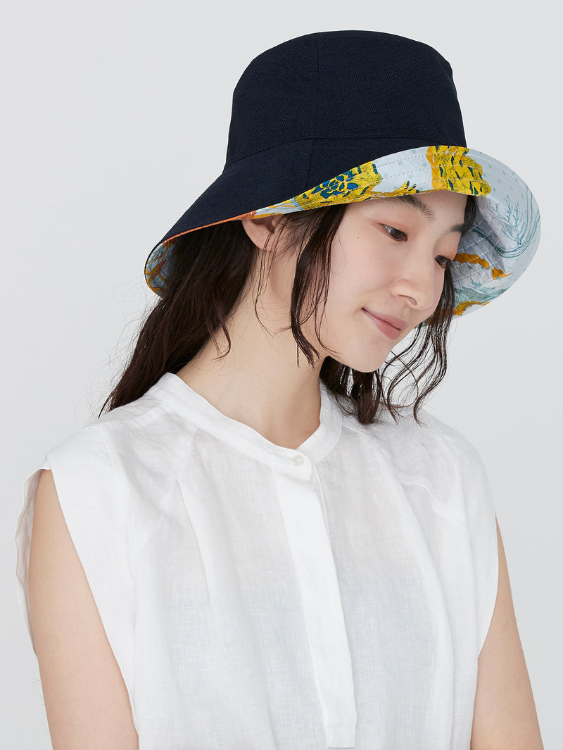 その日の気分やコーディネートでルックチェンジが楽しめるリバーシブル仕立てのバケットハット。manipuriらしい総柄と合わせやすいシンプルな無地の両方を楽しめる一品。つば幅も程よくファッションのアクセントにも紫外線対策にも一役買ってくれるアイテム。カジュアルなデニムからきれいめなスカートまで合わせやすいデザイン。目深にすっぽり被ることで、小顔効果にも期待大!折り畳めばポケットやバッグに収納でき